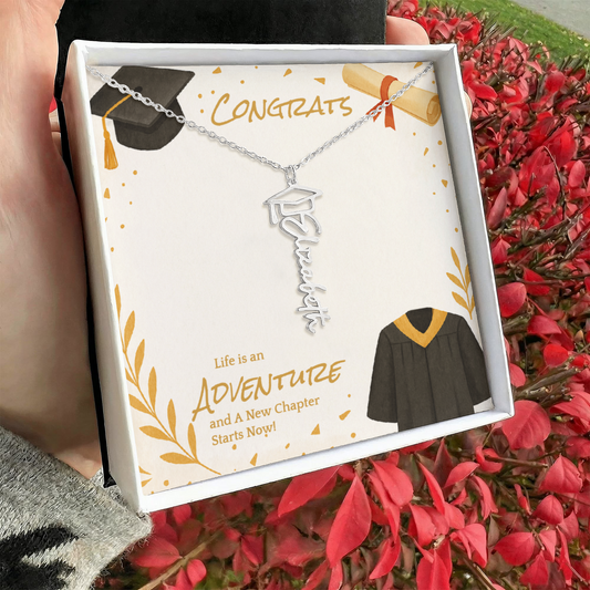 Graduation Cap and Custom Name Necklace. Nothing could be better! - Unisex "Congrats, Life is an Adventure and A New Chapter Starts Now!"