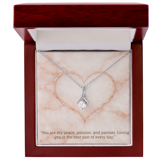 Dazzling Ribbon Necklace. Yellow or White Gold with the message : You are my peace, passion, and partner. Loving you is the best part of every day.