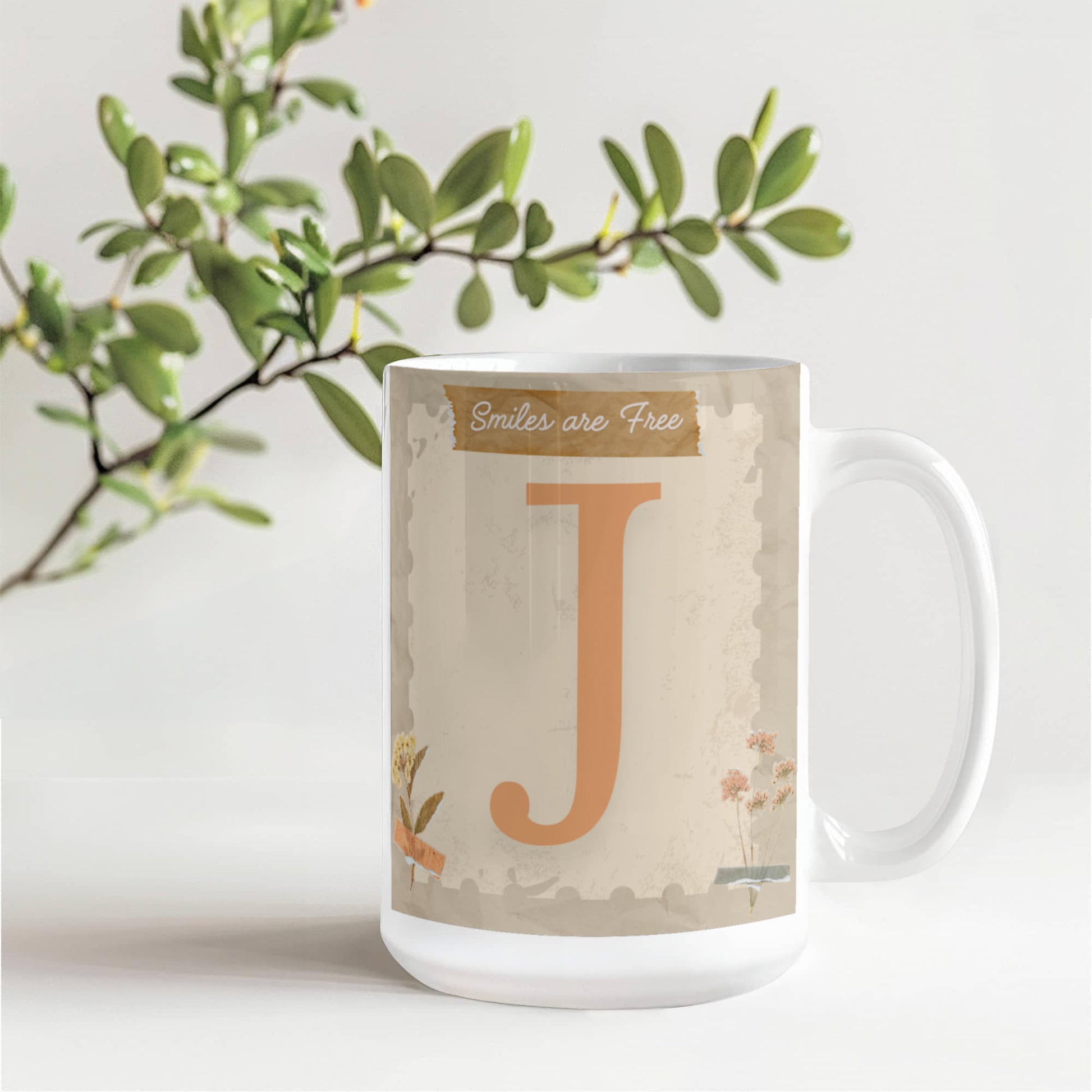 Letter J : Large Initial Mug - with the words "Smiles are Free"